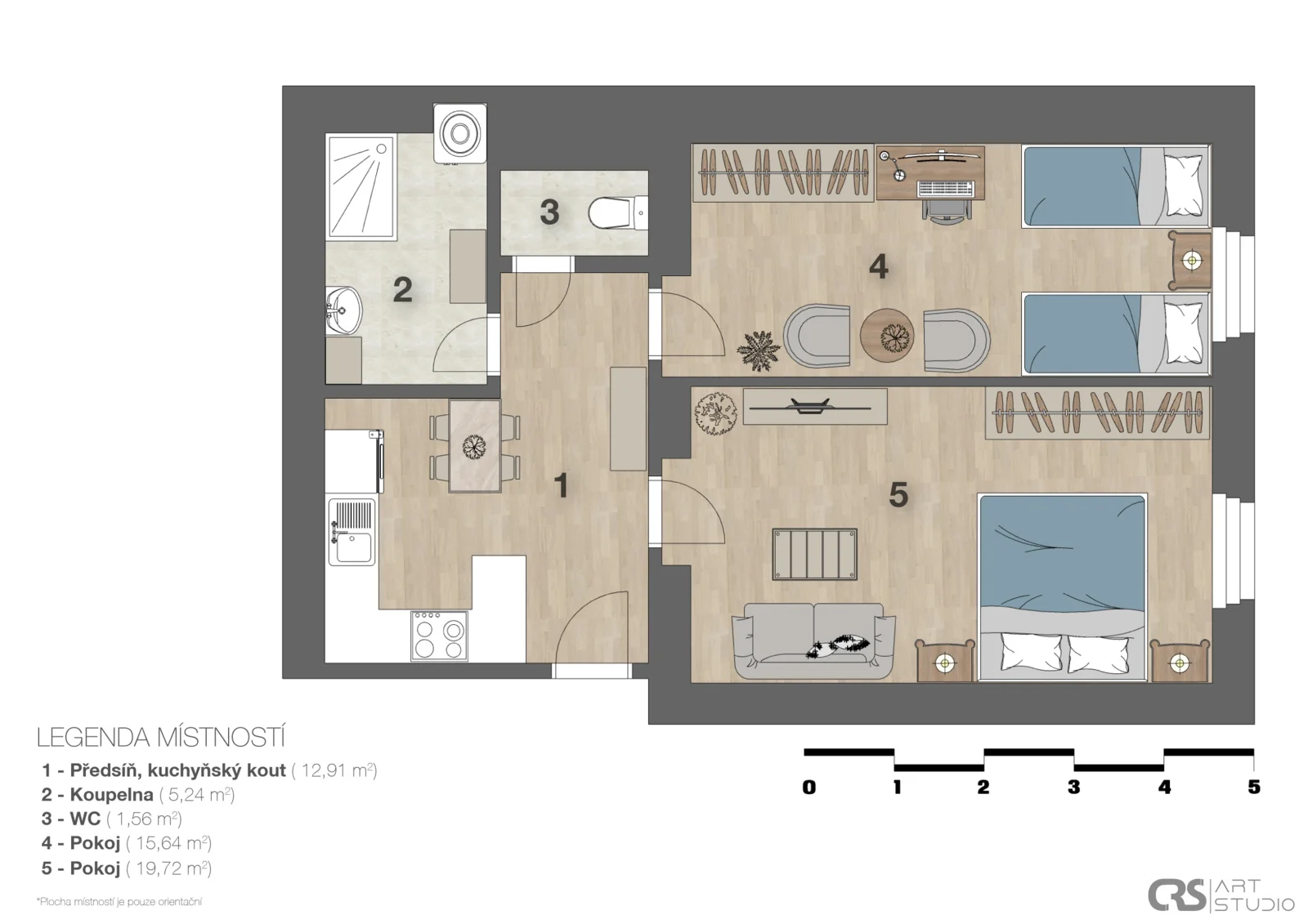 Dispozice nabízí komfortní rozdělení na denní a klidovou část, vhodné jak pro vlastní bydlení, tak i jako investici k pronájmu v dlouhodobě žádané lokalitě. Měsíční zálohy na služby činí 500 Kč na osobu, elektřina se hradí samostatně dle vlastní spotřeby.