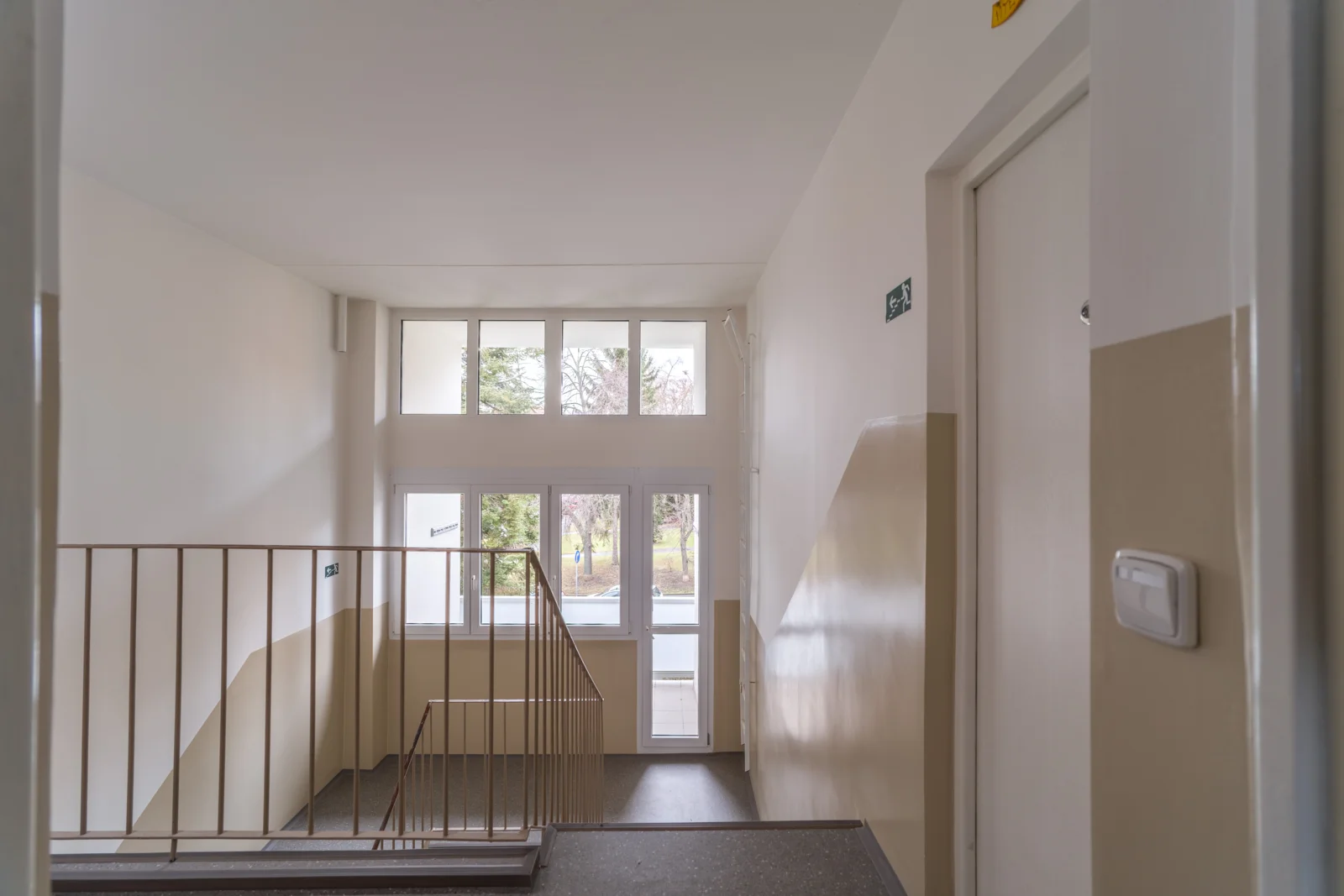 Dům je menší, komorní a prošel kompletní rekonstrukcí – nová okna, fasáda i střecha, opravené společné chodby. Díky tomu má budova PENB B, což znamená úspornější provoz.