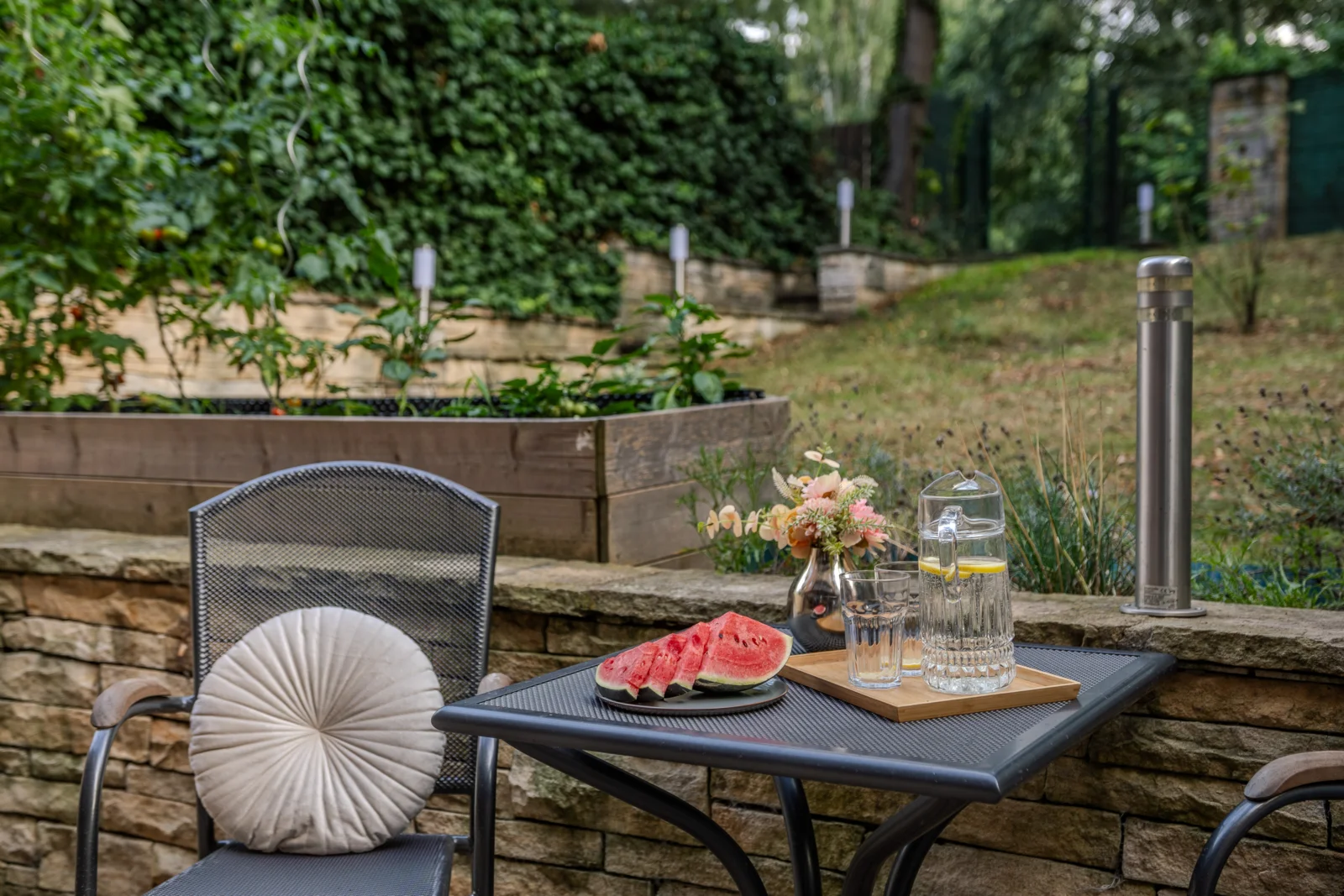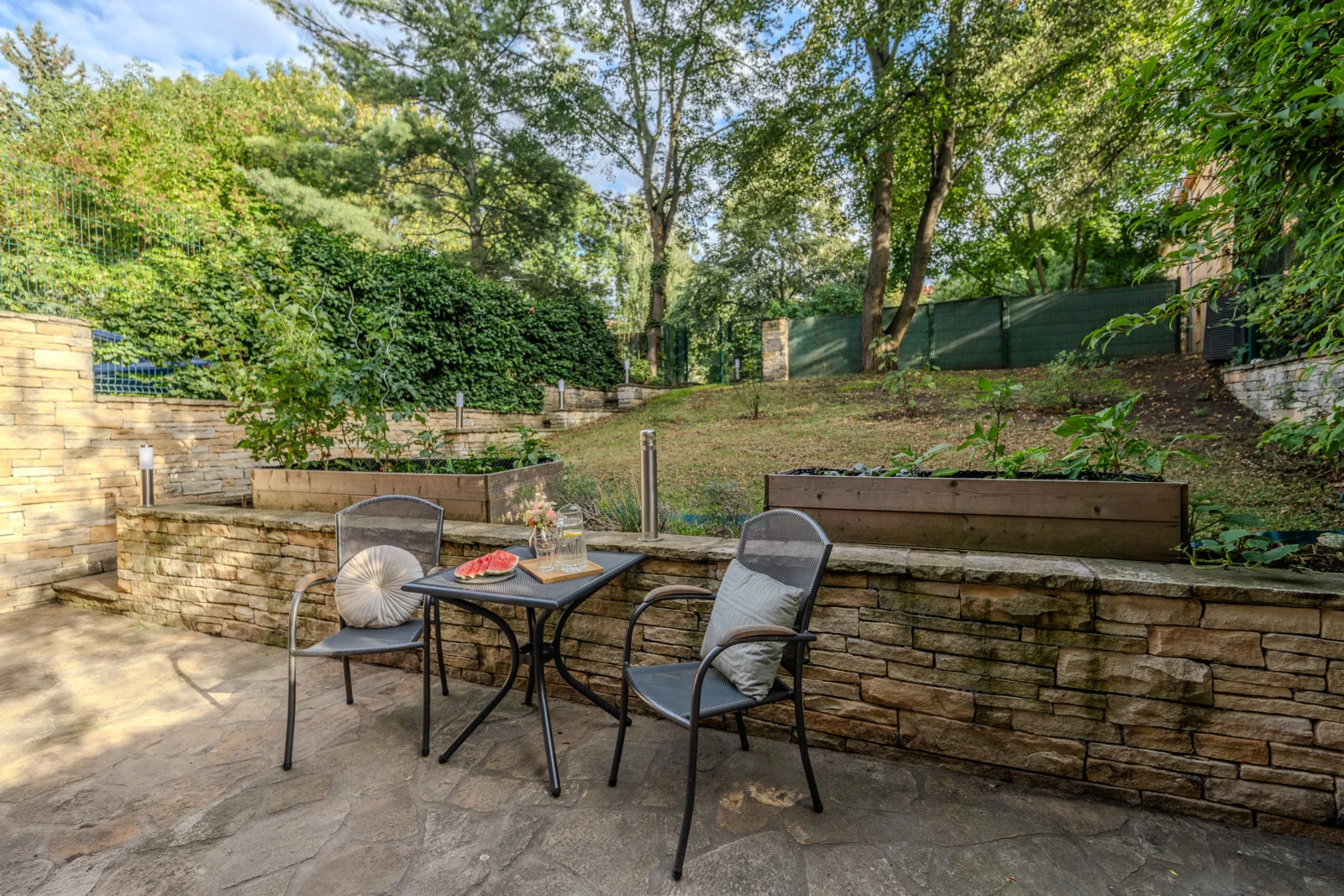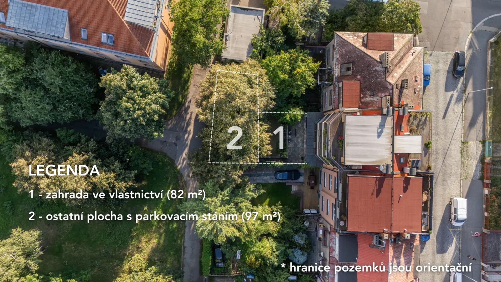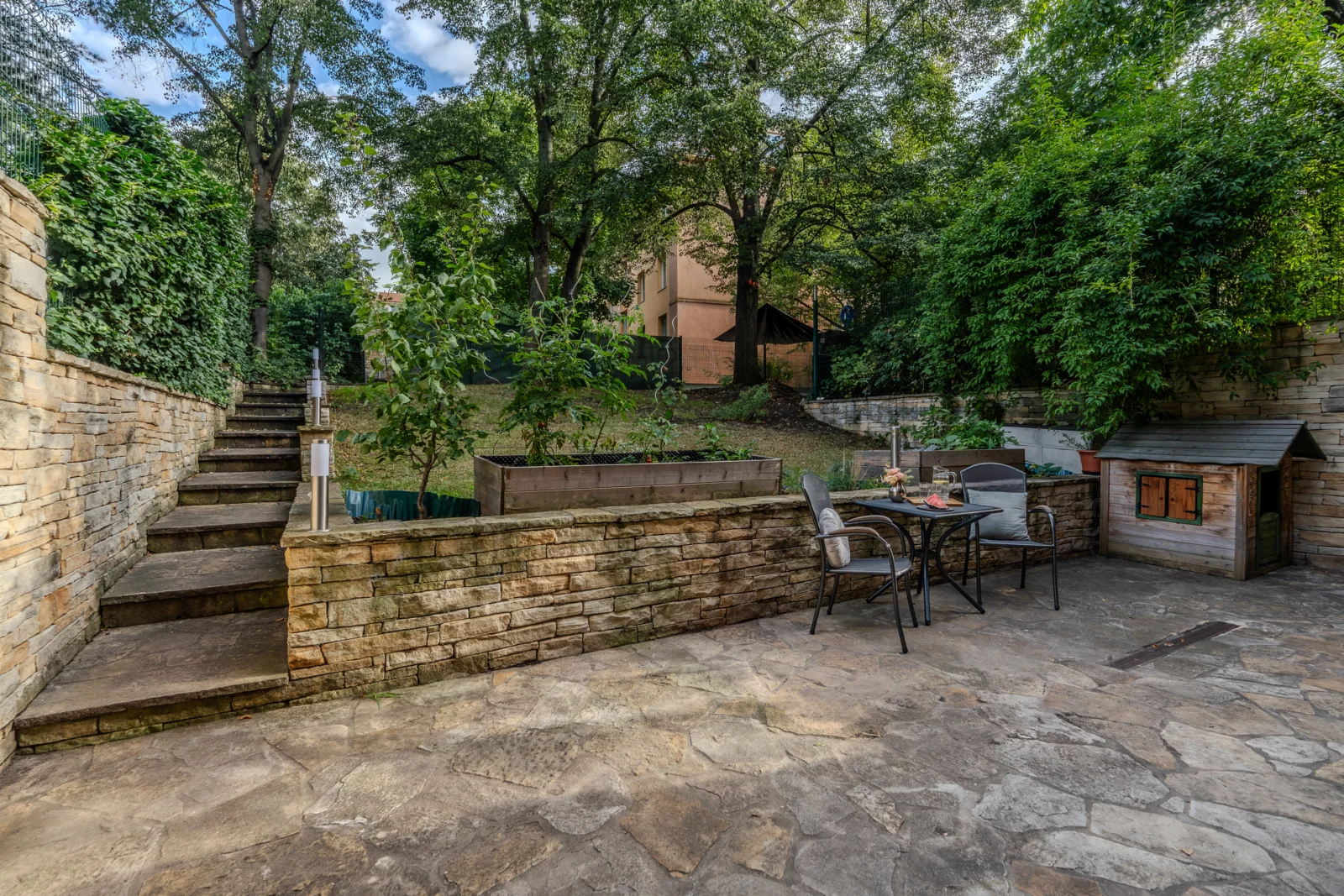 Oplocený pozemek nabízí celkem 179 m2 (82 m2 v osobní vlastnictví a 97 m2 v dlouhodobém pronájmu od Hl. m.). Díky vzrostlým stromům a situováním pozemku do vnitrobloku poskytuje terasa se zahradou naprosté soukromí. Najdete zde prostor jak pro relaxaci, tak pro pěstitelské aktivity. Pro pohodlnou údržbu je na terasu zavedena voda. U brány je připravena elektřina pro instalaci automatického pohonu brány na dálkové ovládání.