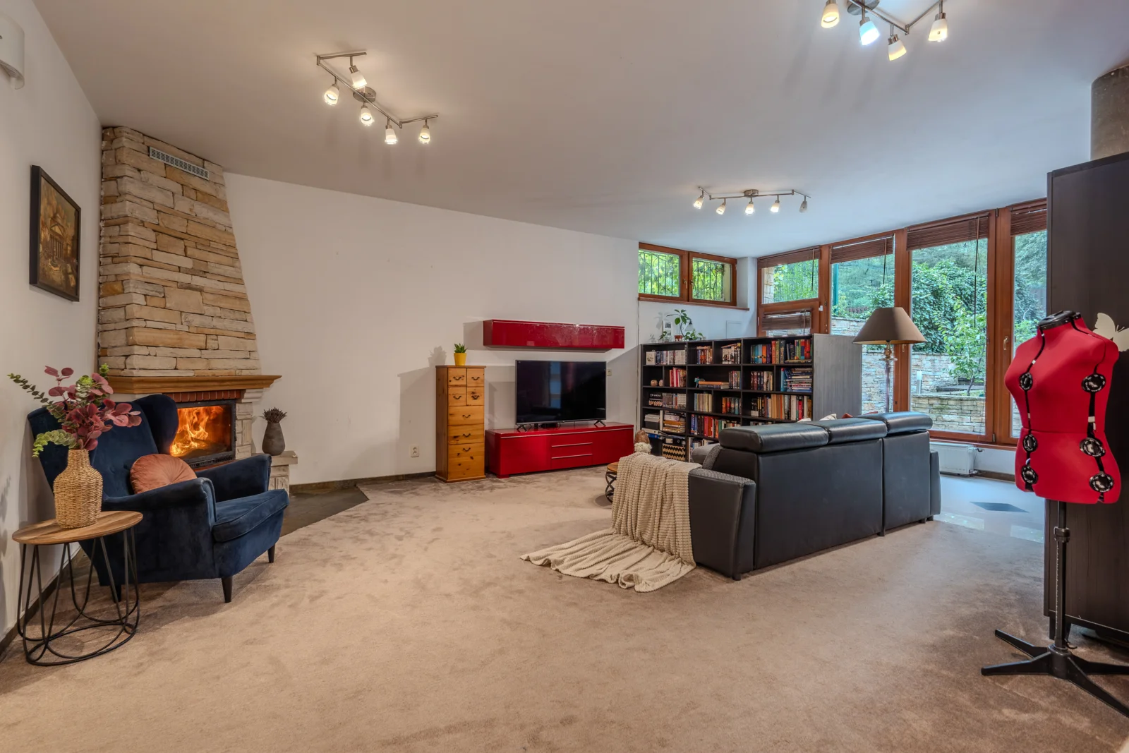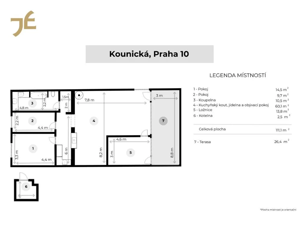 Dominantou bytu je velkorysý obývací pokoj spojený s jídelnou a kuchyňským koutem. Celý prostor je prosvětlen velkoformátovými okny s výhledem na zahradu s terasou, která je přístupná i dveřmi z ložnice. Kuchyně zaujme kamennými deskami a originálním provedením se zrcadly, které prostor opticky zvětšují.