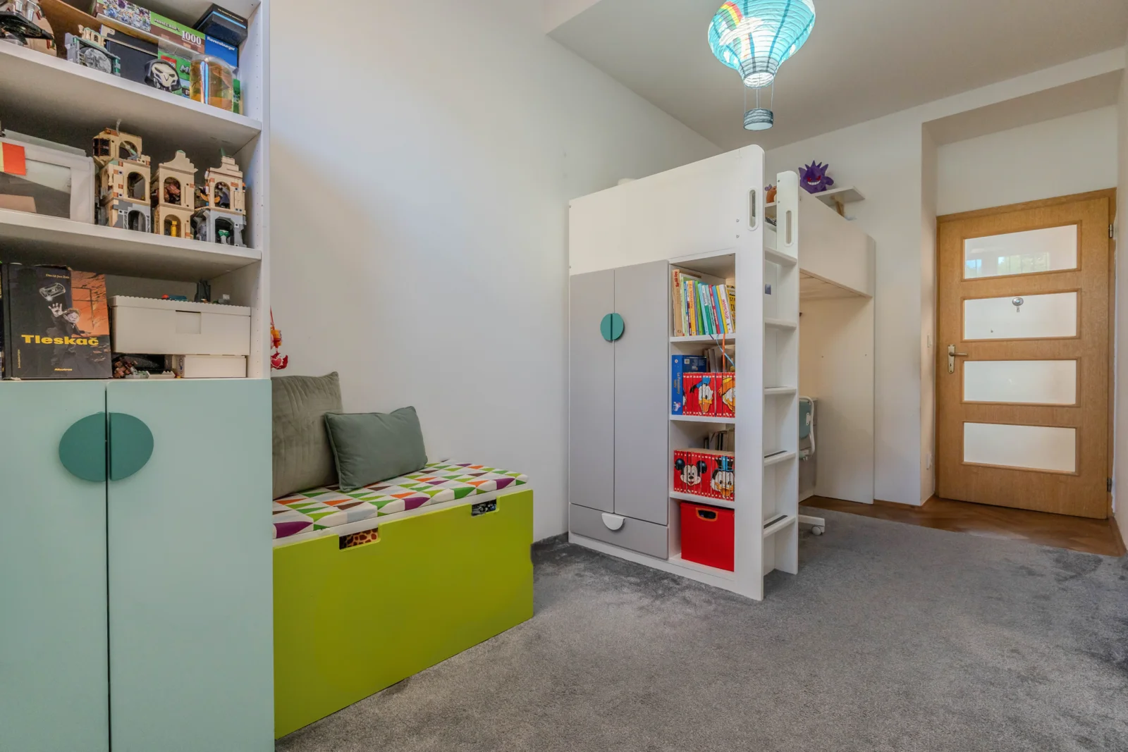 Za kuchyní jsou dva další pokoje, praktická komora a koupelna. Vytápění bytu je řešeno podlahovým topením a radiátory.