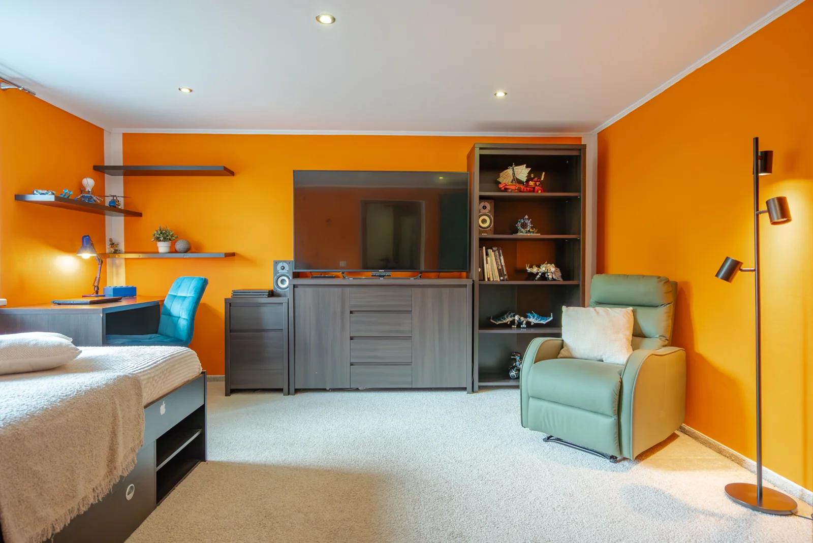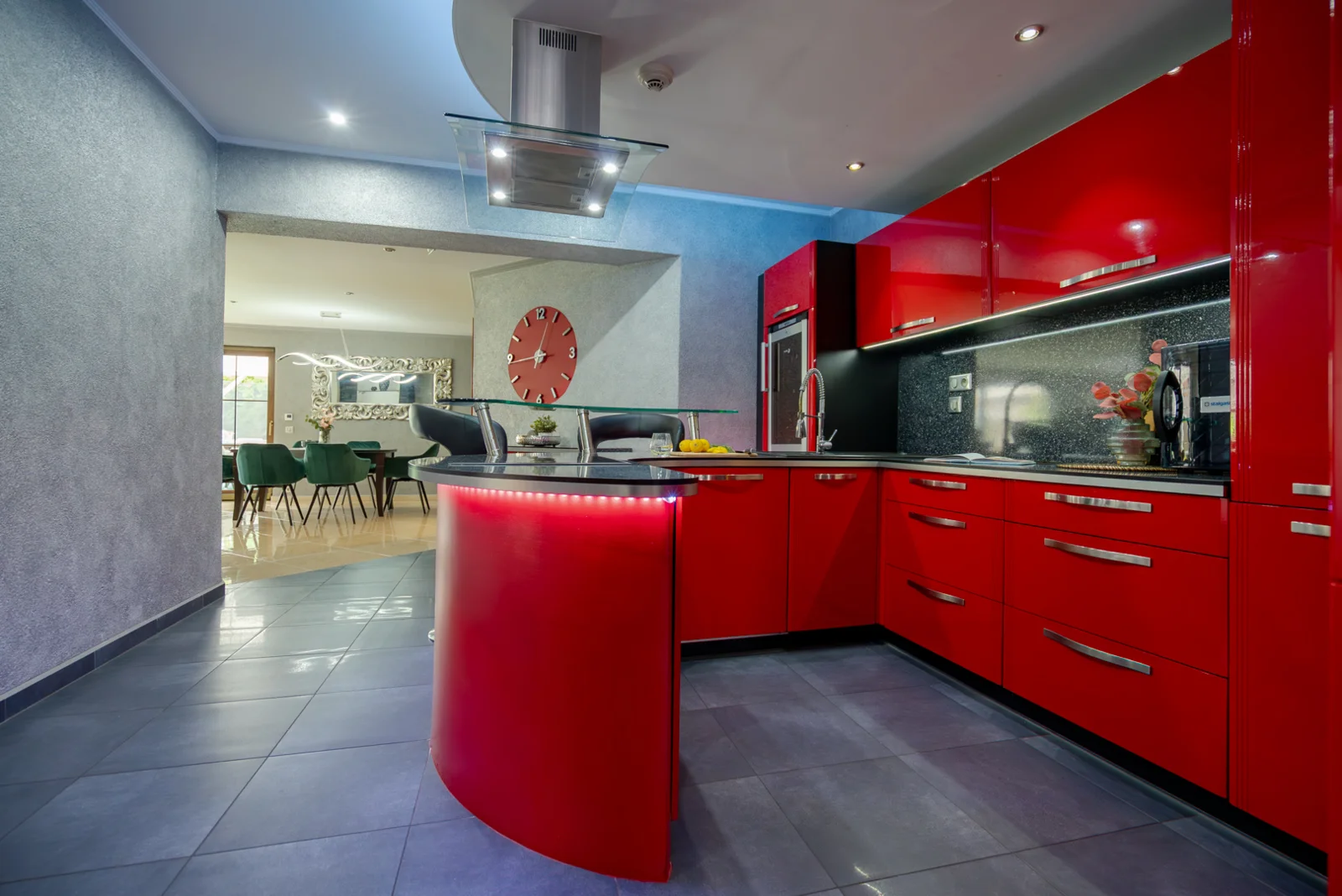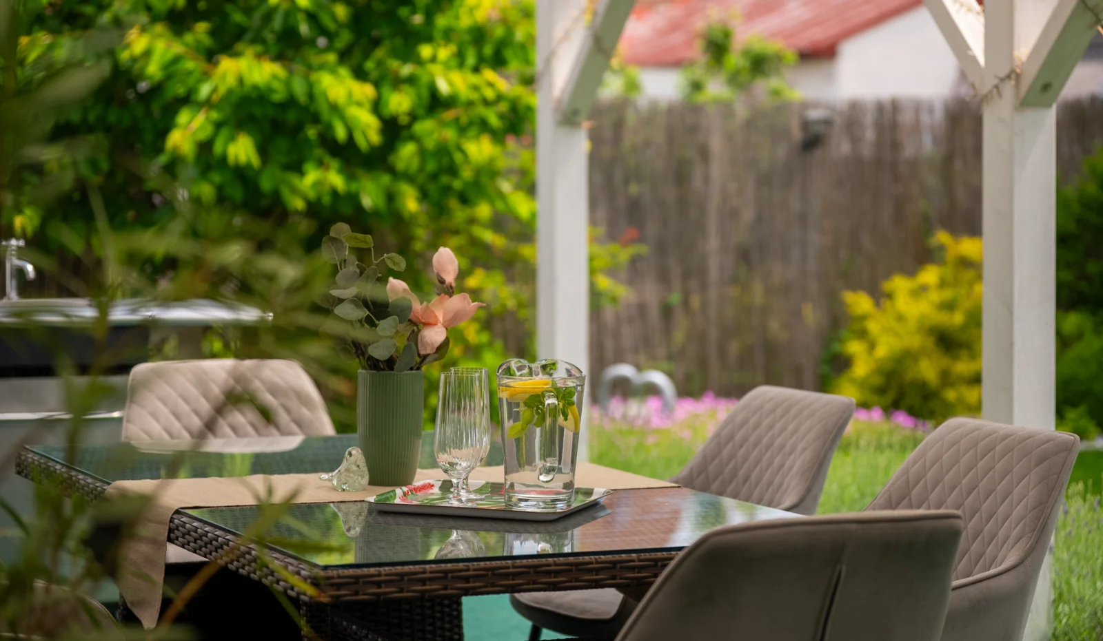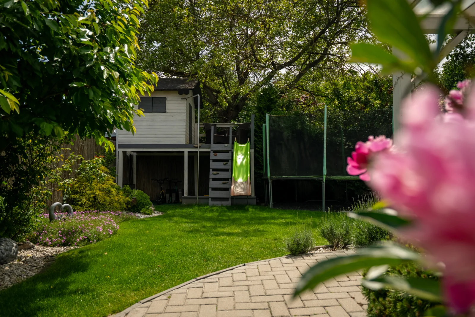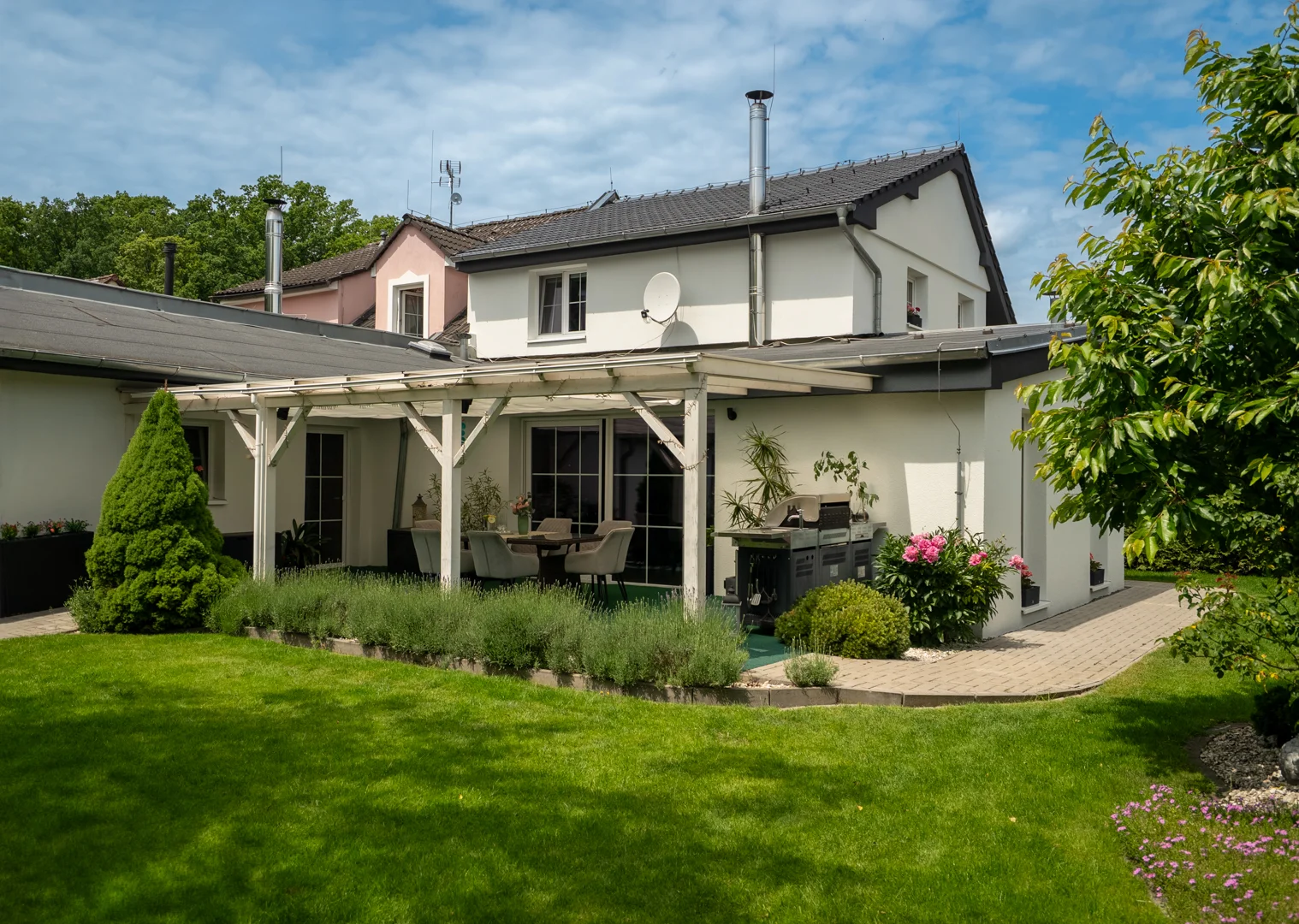 Za domem vznikla citlivě řešená přístavba, jejímž srdcem je velký obývací pokoj s krbovou vložkou (30 kW) – místo pro rodinná setkání, které volně přecházíte francouzským oknem na zastřešenou terasu a zahradu. Z otevřené kuchyně s výrazným červeným jádrem máte neustálý přehled o dění venku – třeba o tom, jak si děti hrají v zahradním domku.