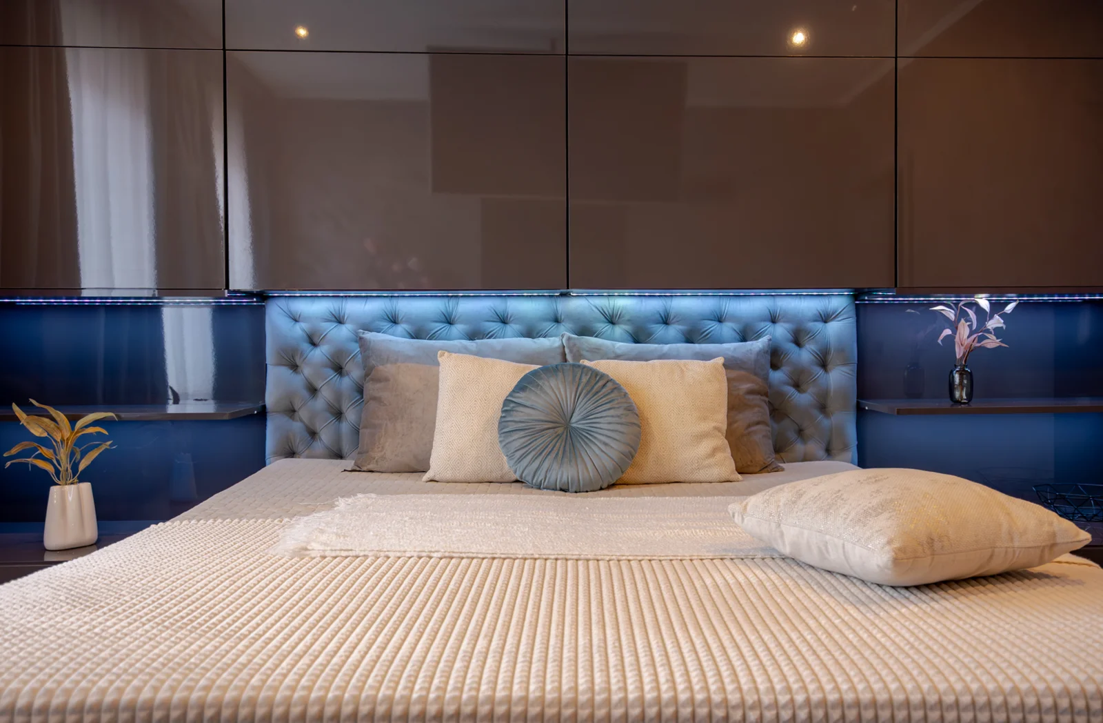 Na kuchyni navazuje ložnice s vestavěnými skříněmi a šatnou skrytou za zrcadlem. Praktické je umístění koupelny s vanou a sprchovým koutem v přízemí. Vstoupit do ní můžete z jídelny nebo přímo z terasy. Za koupelnou je komora/šatna, která by mohla posloužit i jako kancelář se samostatným vstupem.